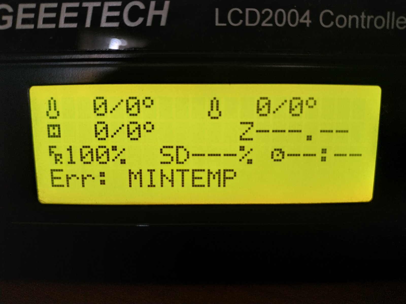 I've assembled it and triple-checked the wiring, but when I power it up, I get the reading you can see in the attached picture. From what I understand, it means that the board receives no thermistor readings. All thermistors except the heat bed's one are connected (it was faulty and I am waiting for the replacement part to arrive).