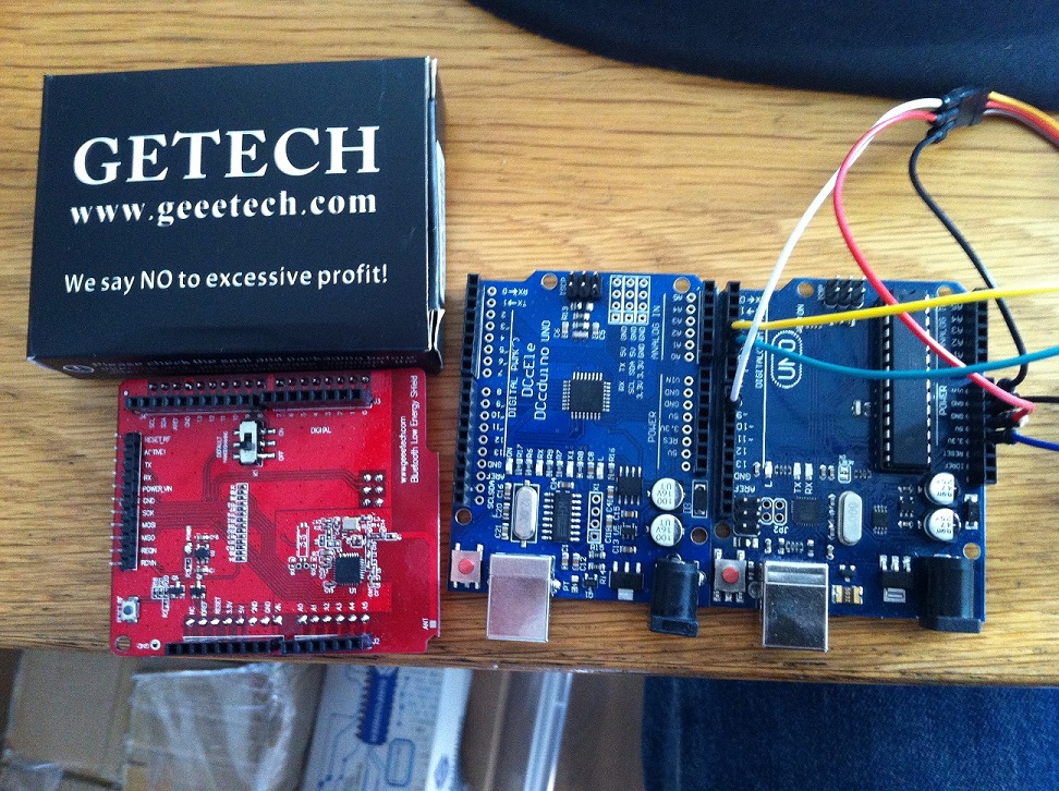 I tried to use your : Geeetech Iduino Bluetooth Low Energy (BLE)Shield nRF8001 for Arduino Uno iOS (ebay 331413507415 ) on