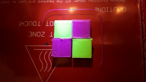 Since single color color printing seems to work at an acceptable ratio of yay/fails, I figured I'd venture into two color printing. Per the user manual for the Pro C dual extruder, I downloaded and sliced the two color cube. I'd call the resulting print kind of successful. The issue is the squares don't quite line up. They're close, but one quadrant is barely attached. As viewed from the top, there is a gap between the lower left/upper right purple and the green in the lower right.