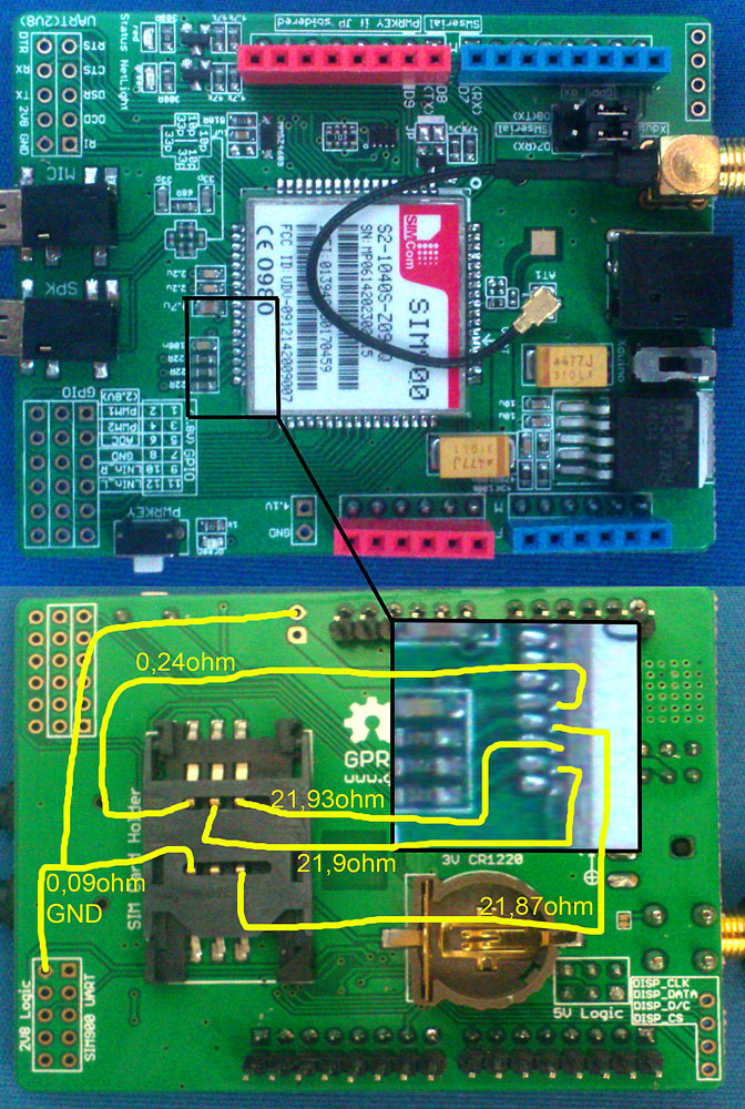 I measured all soldered connections simconector to sim900 and everything is soldered well, the picture shows the measured values certifying that the connector and soldered connections are ok, there remains the error in SIM900,