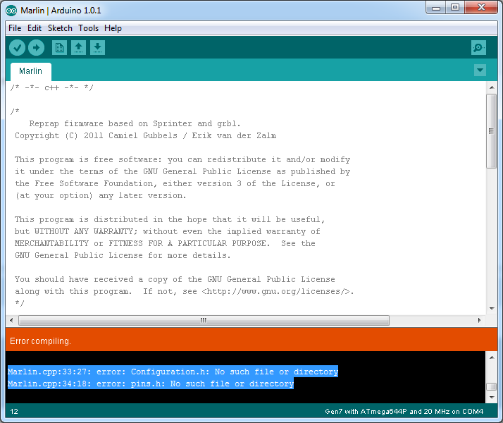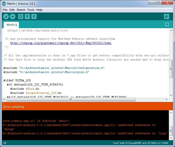 I did refer to the link/wiki, as I have been instructed multiple times by GeTech's staff and the forum moderators. It is incomplete. The files posted don't work. The Marlin.ino in the "Melzi printer.zip" downloaded from the Wiki can't even compile. I uninstalled the current release of Arduino IDE 1.0.5 and installed the v1.0.1 from the link in the Wiki. Upon opening the Marlin.ino in this outdated Arduino IDE, it notifies me it can't open it unless it creates a new sketch folder named Marlin and places the .ino file in that location. After permitting it to take those actions, I tried compiling the Marlin.ino. It presents the error in the first screen shot.