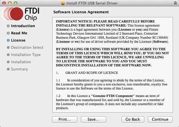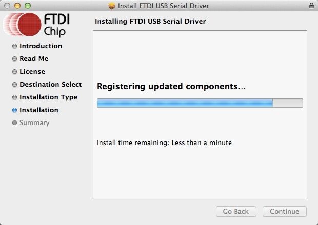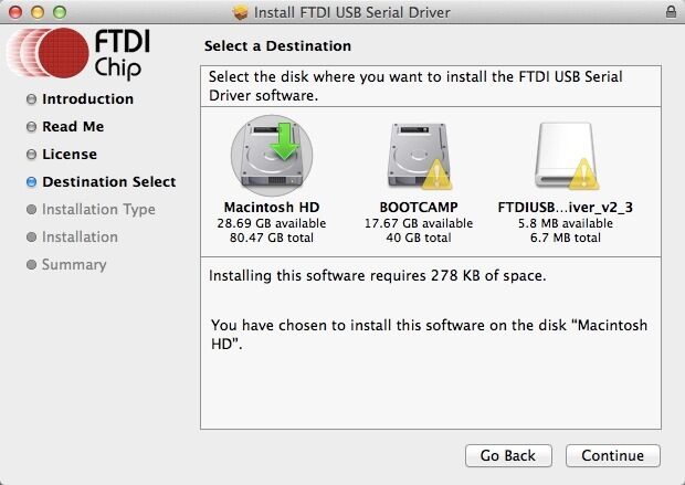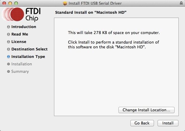 I downloaded the driver from, http://www.ftdichip.com/Drivers/VCP.htm i got the download link from the table, clicked on 2.3, the file i got is FTDIUSBSerialDriver_v2_3.dmg it installed correctly no error messages.
