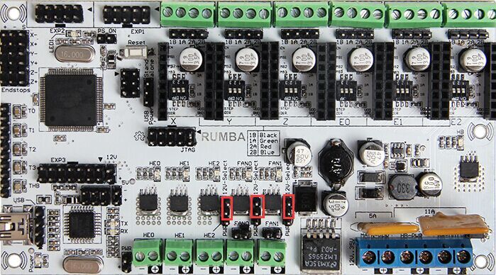 I recently bought a rumba controller board and had it up and running for a short time when all power towards the hotend and fan connector stopped working. Stepper motors are still operational and the hotend and fan controllers are only half lit when code is sent to them. All their voltage read zero.
