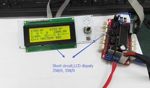 2) Make the both thermistor slots short circuit by plugging jumper caps. The LCD will display 358/0,358/0 , MAXTEMP.