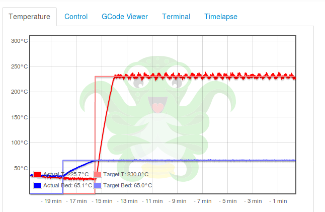 The problem: After climbing up to the 245°C region, the temperature is jumping between 241°C and 249°C and the print actually never starts, not even after 15 minutes of waiting.