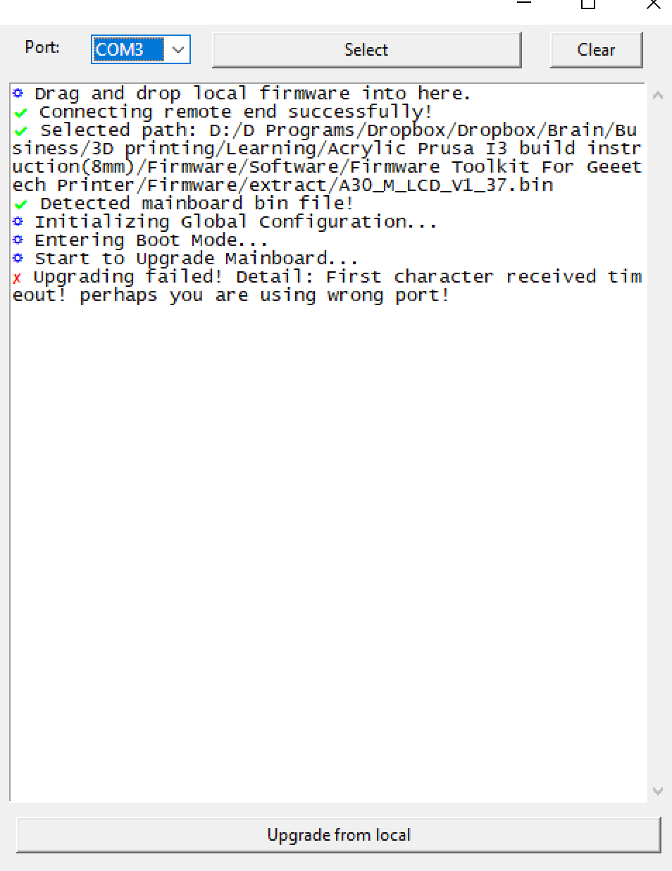 I select the correct port being COM3 and then click select and choose the "A30_M_LCD_V1_36" however I get below error.