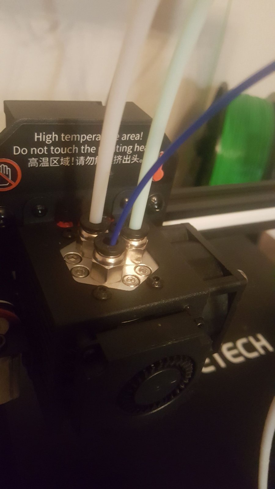 Two of the colors can be extruded. But the color in the front input to the hot end will not print. The motor works and pushes filament successfully. But it cannot push filament into the hot end.